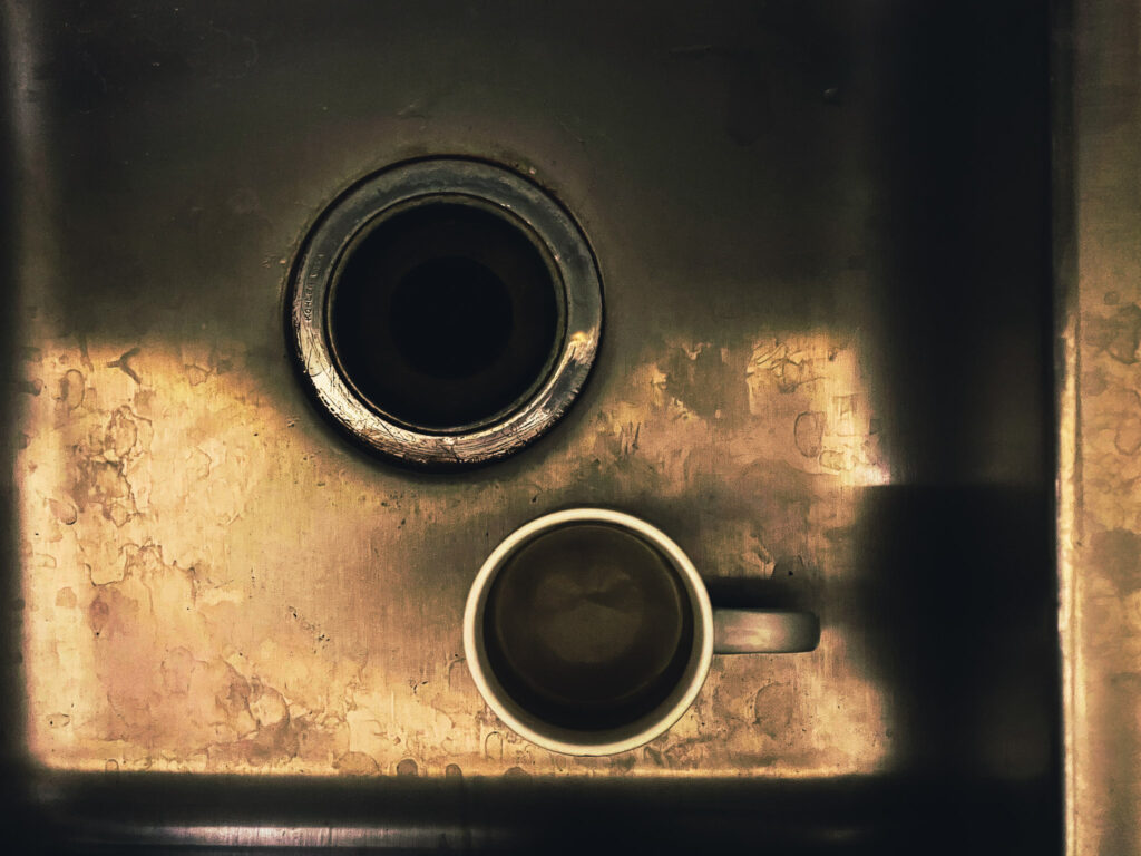 So yeah, the coffee mug is still sitting in the sink. I wanted to take a photo that felt balanced with the drain and edges of the sink, so I moved the cup and reframed a little. I also moved the cup into the light. I don’t really like any of the photos but I had my fun.