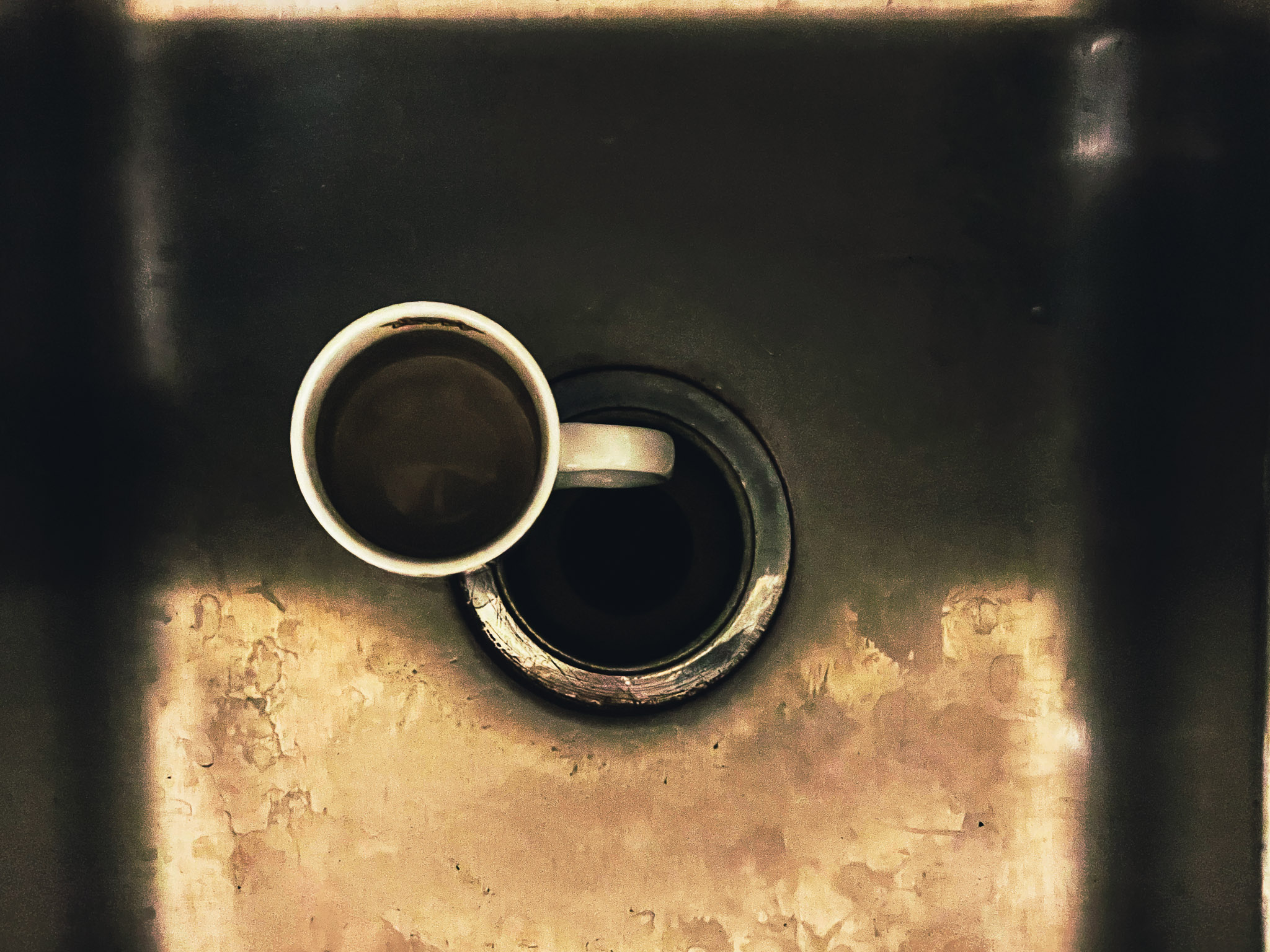 So yeah, the coffee mug is still sitting in the sink. I wanted to take a photo that felt balanced with the drain and edges of the sink, so I moved the cup and reframed a little. I also moved the cup into the light. I don’t really like any of the photos but I had my fun.